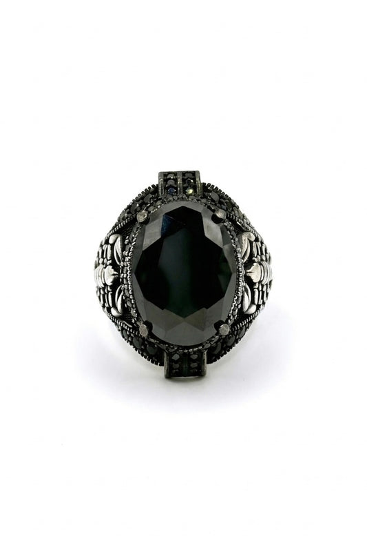 Anello Uomo Argento 925 con Pietra Nera lucida e dettagli Dorati