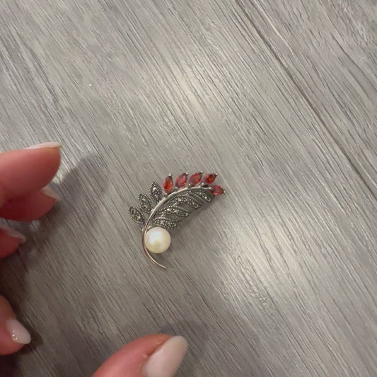 Spilla Vintage in Argento 925 con Perla, Marcasite e Pietre di Granato