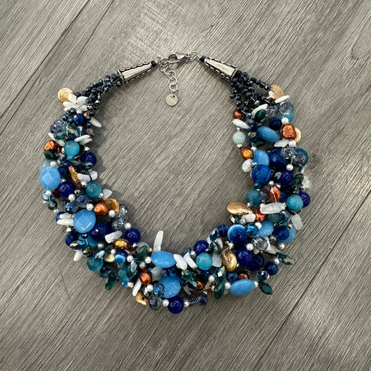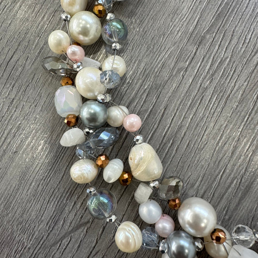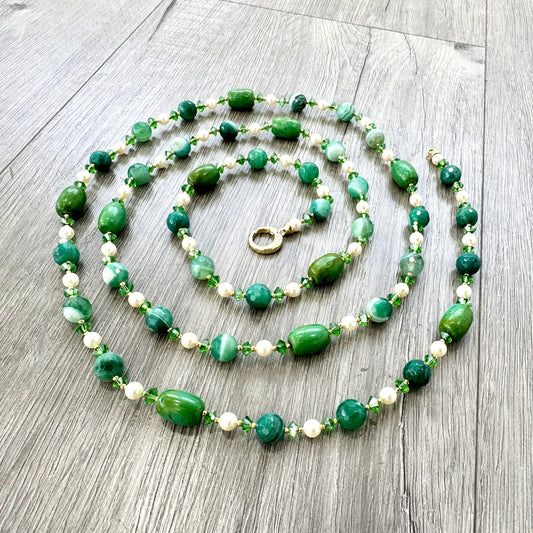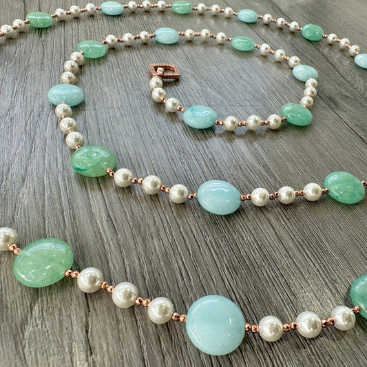 Collana in Argento Rosato con Perle, Giada Verde e Azzurra e Marcasite Rosa