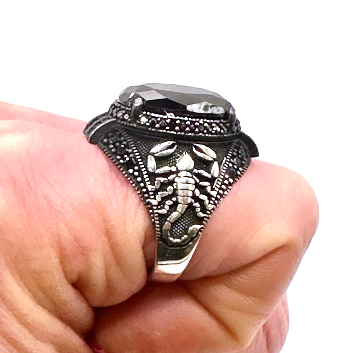 Anello Turco con pietra zircone cubic nera incastonata. Sui lati e’ raffigurato uno scorpione in rilievo , con piccoli zirconi incastonati che ne rifiniscono i contorni