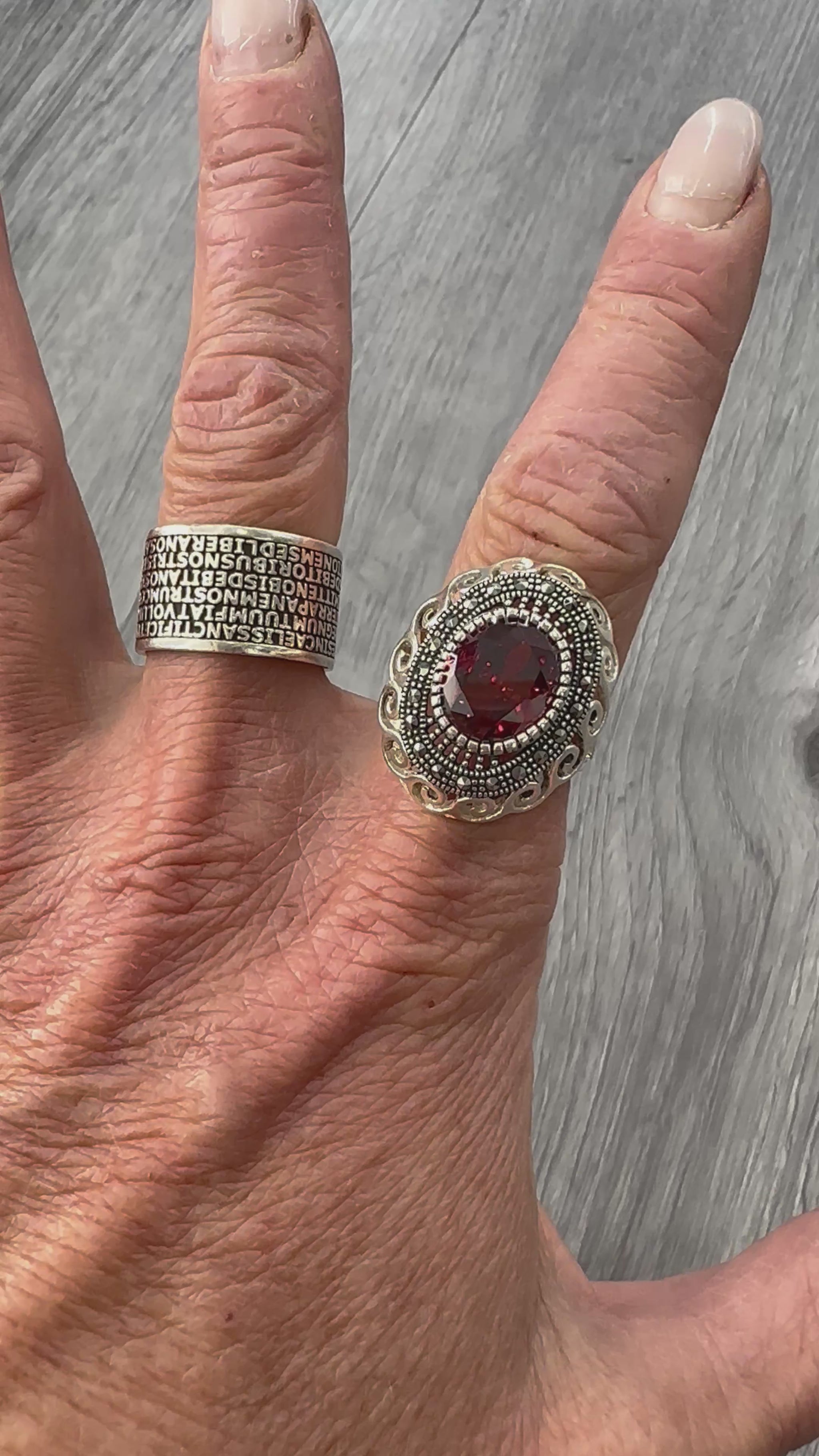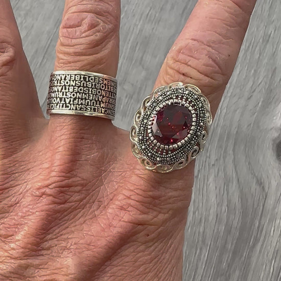 Questo elegante anello artigianale è realizzato in Argento 925 e presenta una splendida pietra di Granato sintetico ovale, tagliata a sfaccettature per esaltarne la brillantezza e il colore rosso intenso.
