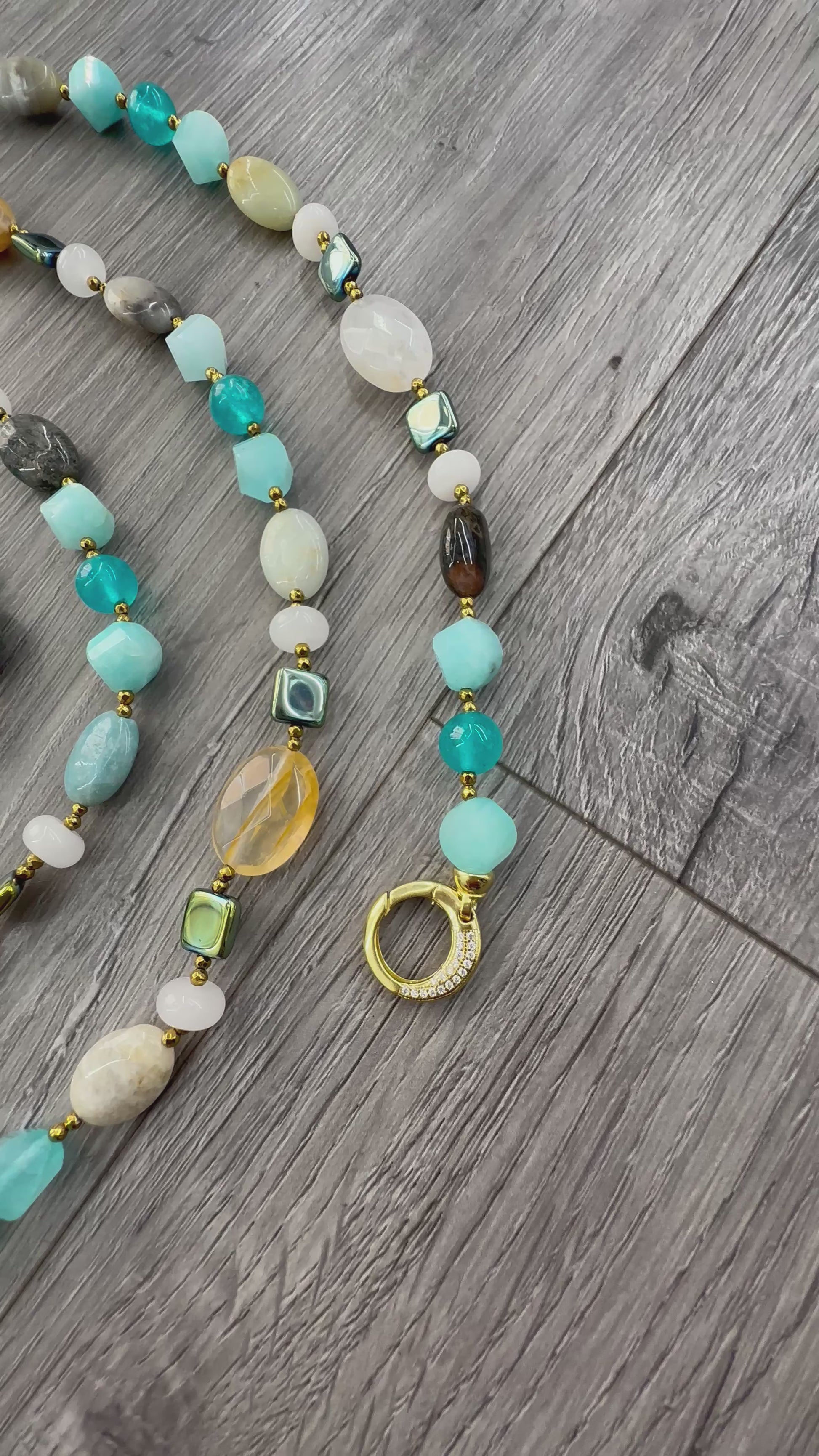 Questa collana artigianale è realizzata con una raffinata combinazione di pietre naturali accuratamente selezionate per la loro bellezza e le loro proprietà energetiche.