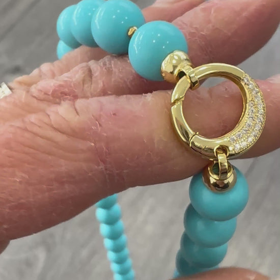 Questa collana in pasta di turchese illumina il viso con le sue tonalità azzurre e vivaci, mentre i piccoli inserti in ematite dorata aggiungono un tocco di raffinatezza e calore. La chiusura in argento completa il design con una finitura preziosa e duratura.
