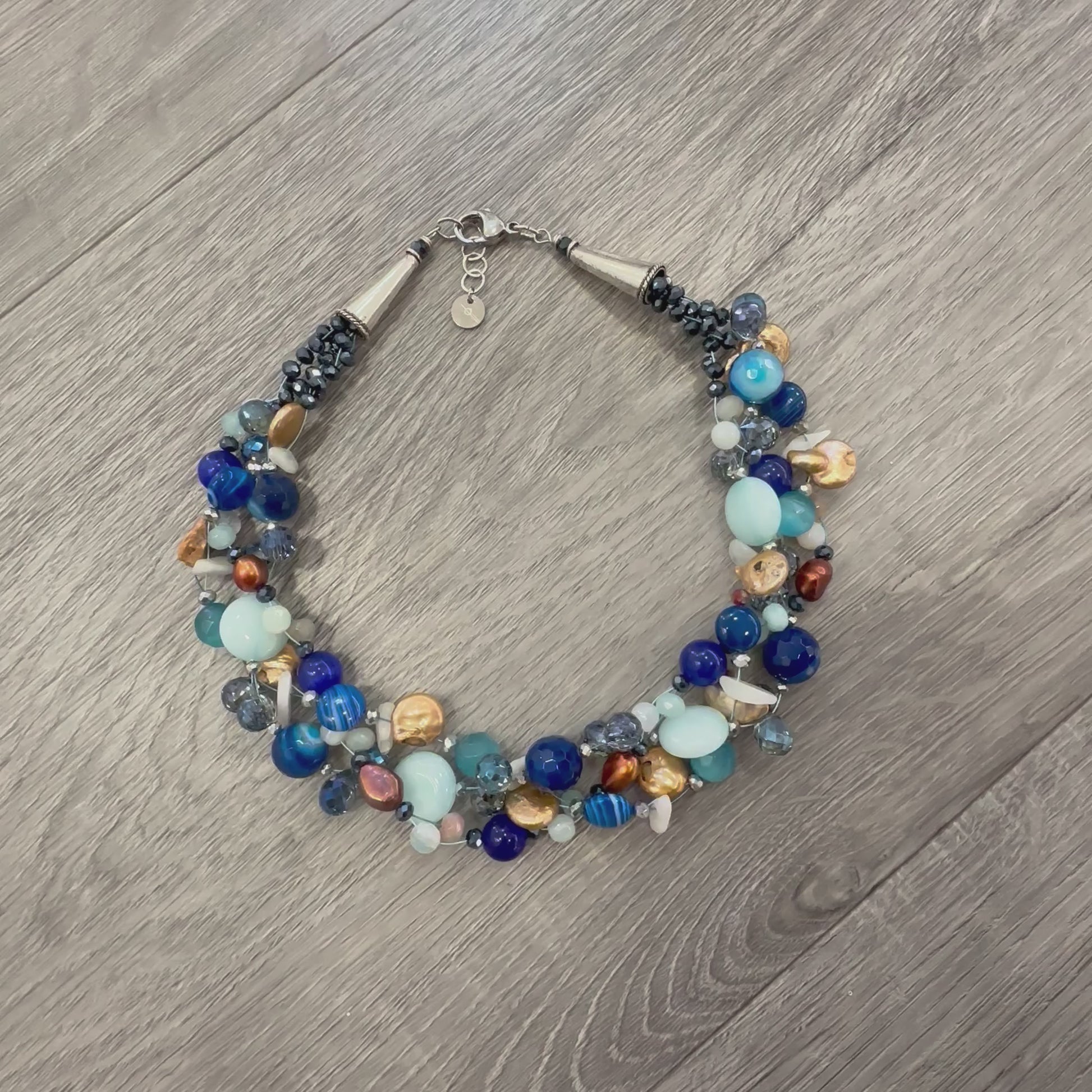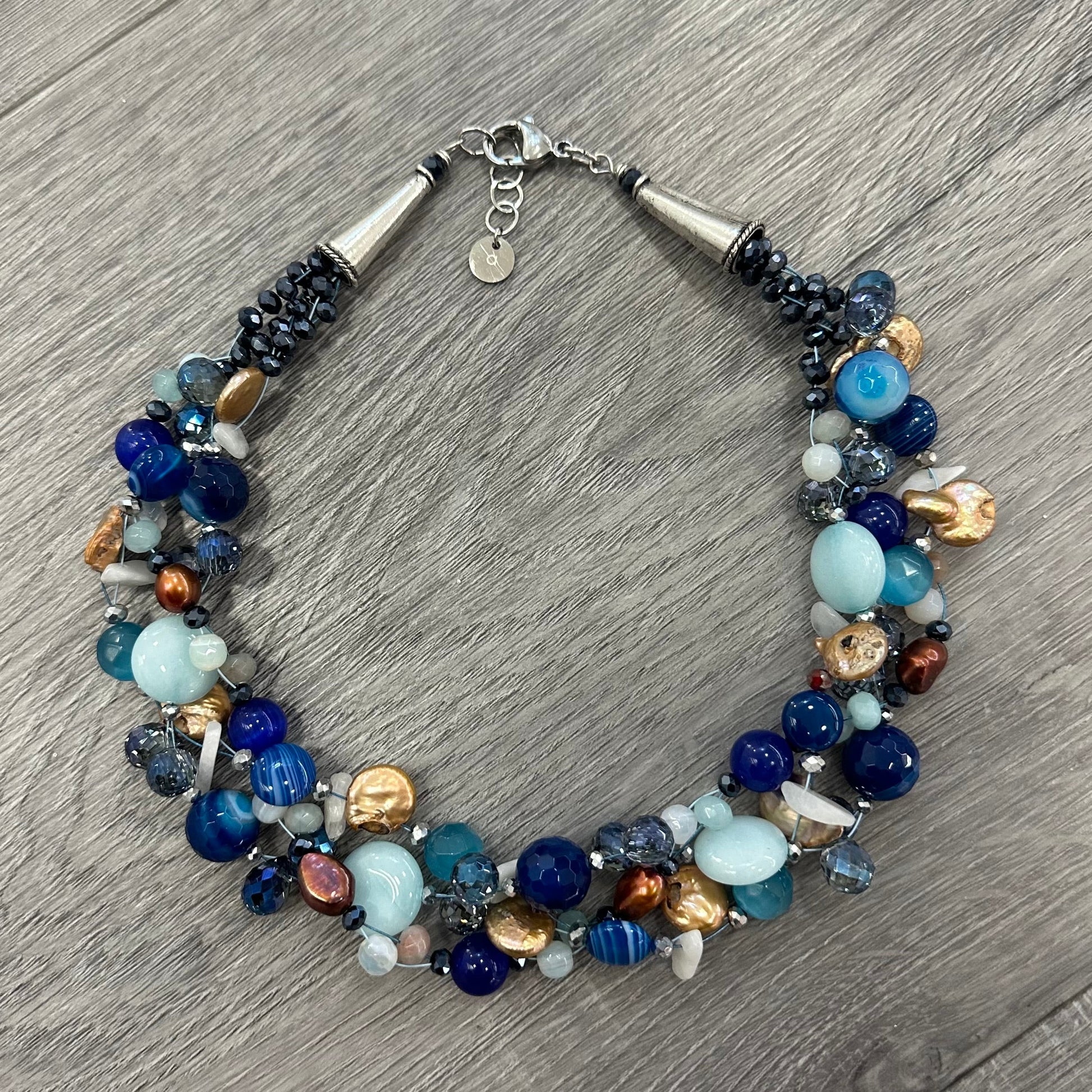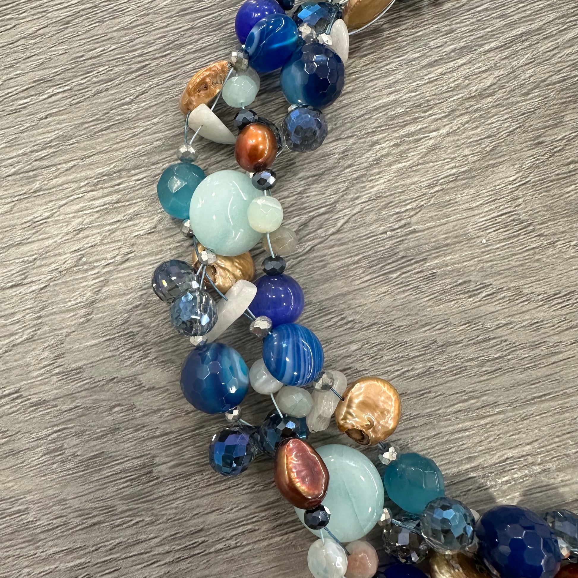 Le pietre utilizzate sono: Perle Naturali bronzo (6mm), Perle naturali irregolari color bronzo, (10mm), Pietra di Agata striata blu (14mm e 10mm), Pietre di Agata blu liscia(10mm) Pietre Occhio di Gatto blu (8mm) Cristalli di varie grandezze e colori