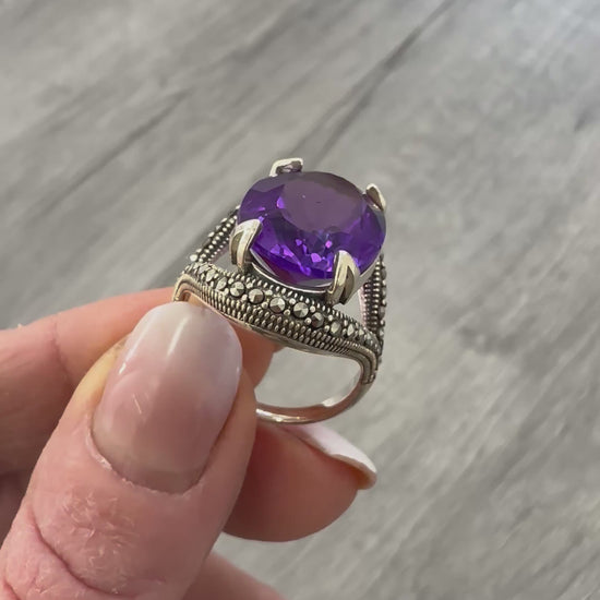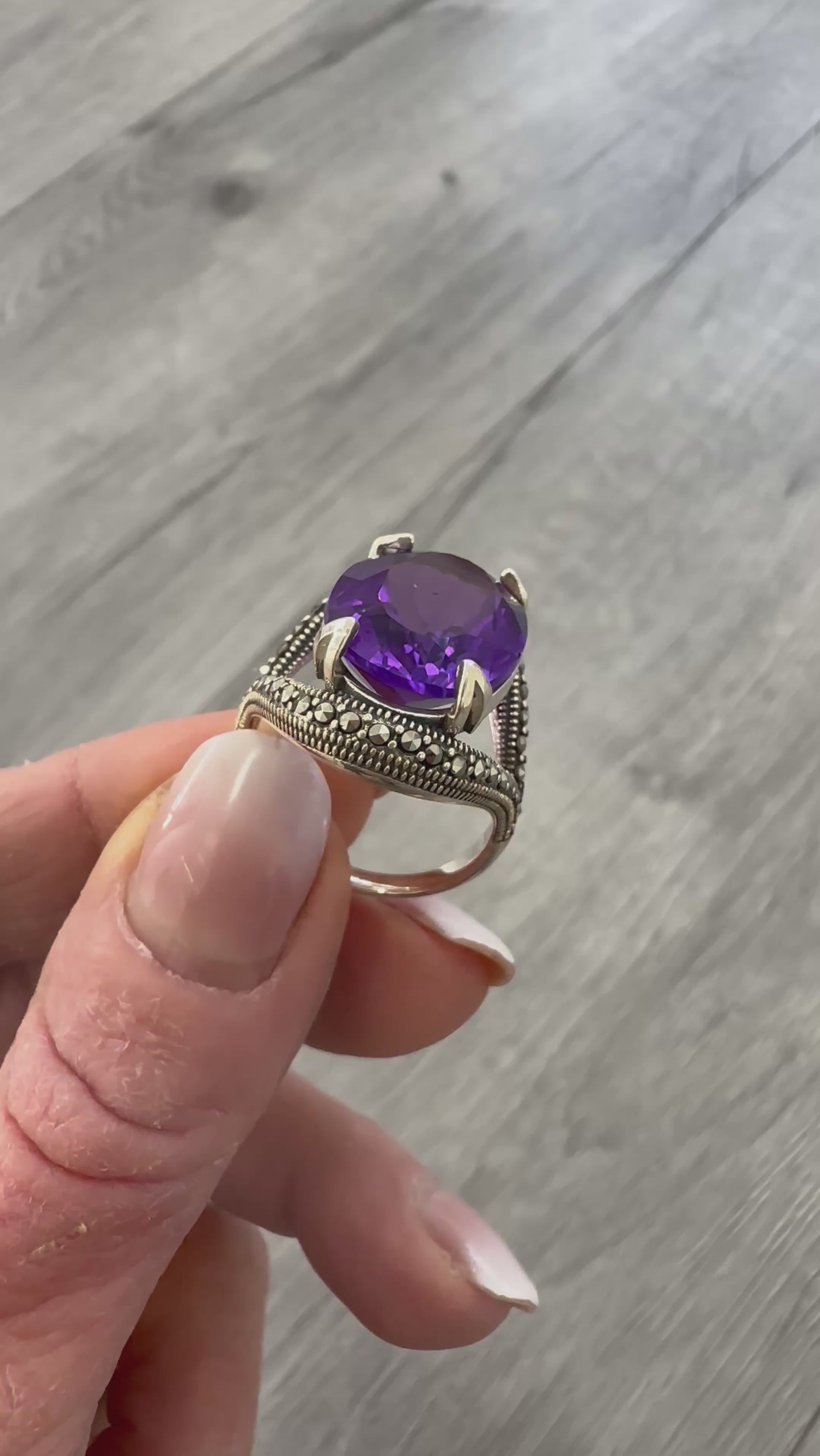 Anello in Argento 925 con Grande Ametista Viola e Dettagli Marcasite