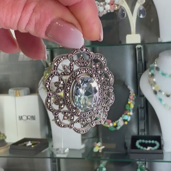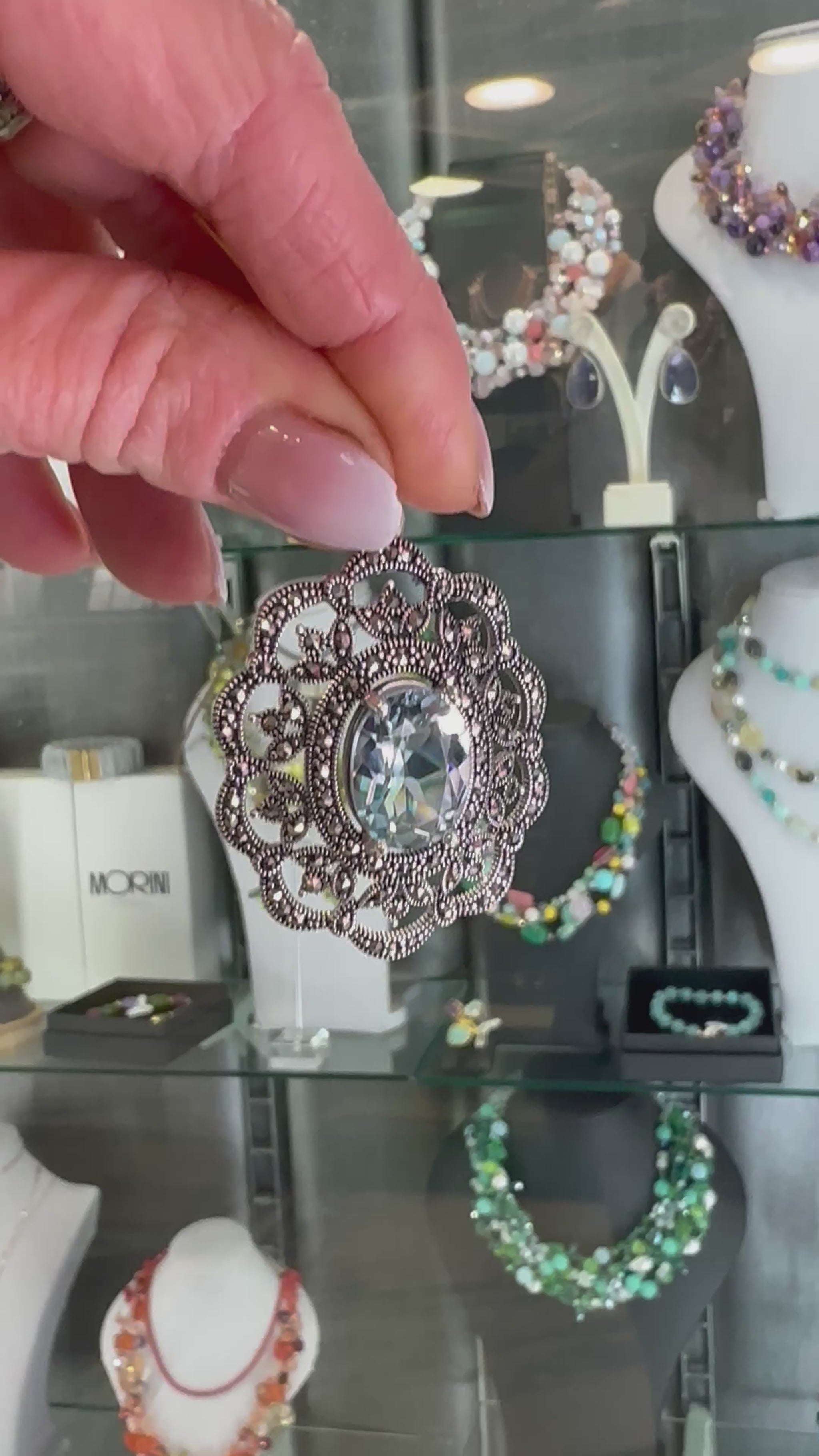 La cornice ricca di dettagli ed impreziosita con piccole pietre di Marcassite richiama i gioielli d’epoca, rendendolo un accessorio ideale per chi ama la classe senza tempo e l’artigianalità.